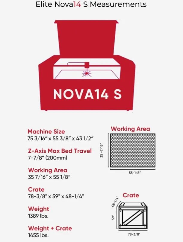 It’s perfect for detailed work on wood, acrylic, leather, fabric, and more. Think large custom signage, oversized personalized gifts, or full-scale product prototypes. The spacious bed fits comfortably in professional workshops, makerspaces, or production studios, yet delivers the same precision and speed as top-tier industrial lasers. As your business grows, the Elite Nova 14S Redline keeps pace—handling oversized one-off projects just as efficiently as small batch runs. If you want to expand your creative capabilities, work faster, and tackle bigger designs with pinpoint accuracy, the Nova 14S Redline is ready to deliver. Its versatility and capacity help bring your biggest ideas to life, no matter the scale.