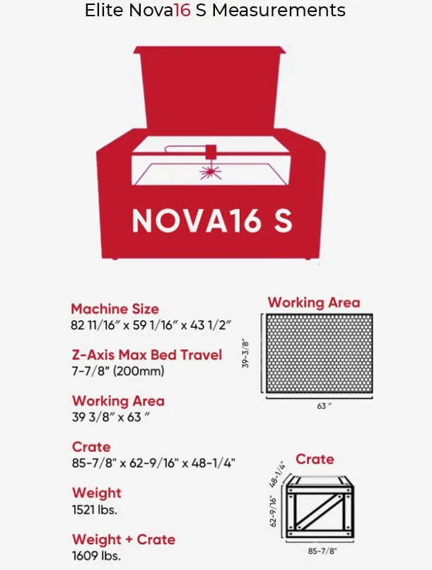 It’s perfect for detailed work on wood, acrylic, leather, fabric, and more—especially when size matters. Think massive custom signage, large-format art installations, oversized personalized products, or full-scale prototypes. The expansive bed fits seamlessly into professional workshops, production floors, or makerspaces, while delivering the same pinpoint precision and blistering speed as high-end industrial lasers. As your business grows, the Elite Nova 16S Redline keeps up—effortlessly handling extra-large one-off pieces and high-volume production runs alike. If you’re ready to push creative boundaries, work faster, and take on your largest, most ambitious projects, the Nova 16S Redline is built to make it happen. Its unmatched capacity and versatility turn even your boldest ideas into reality.